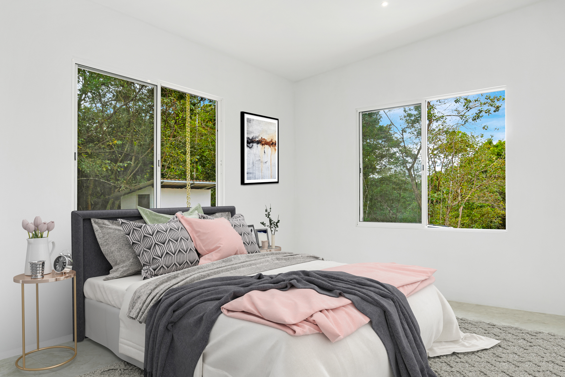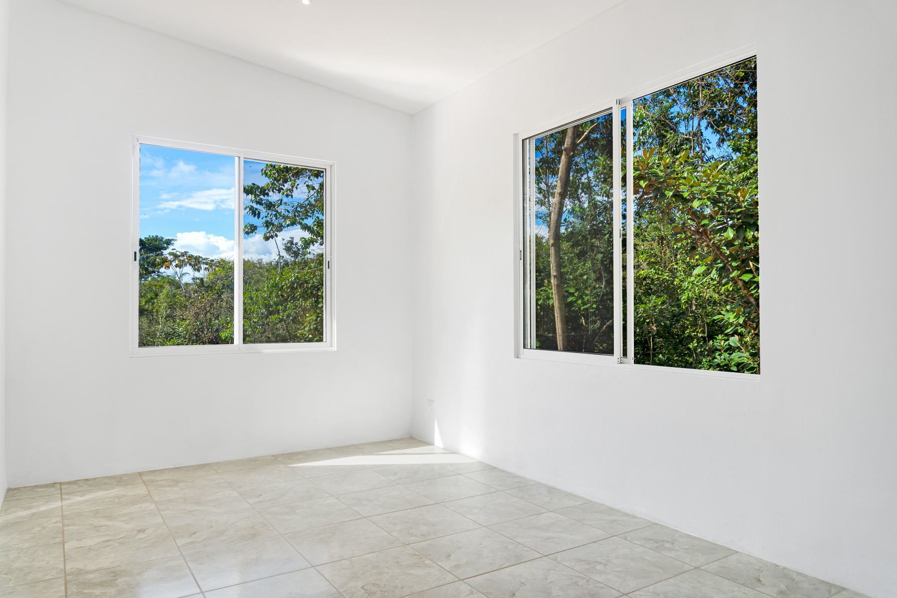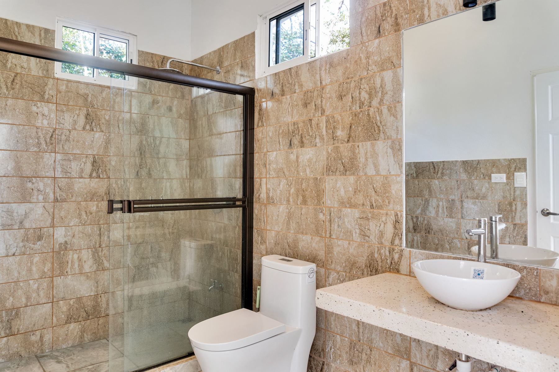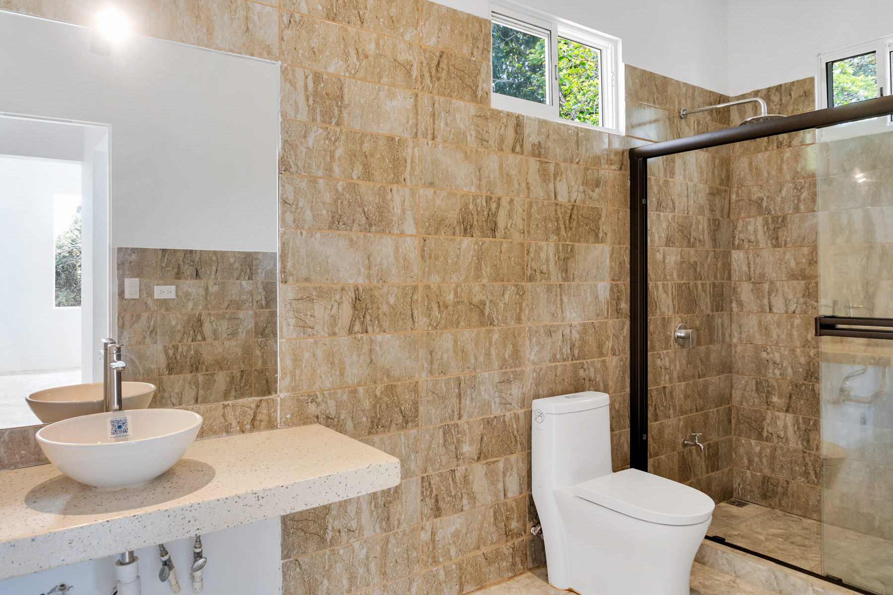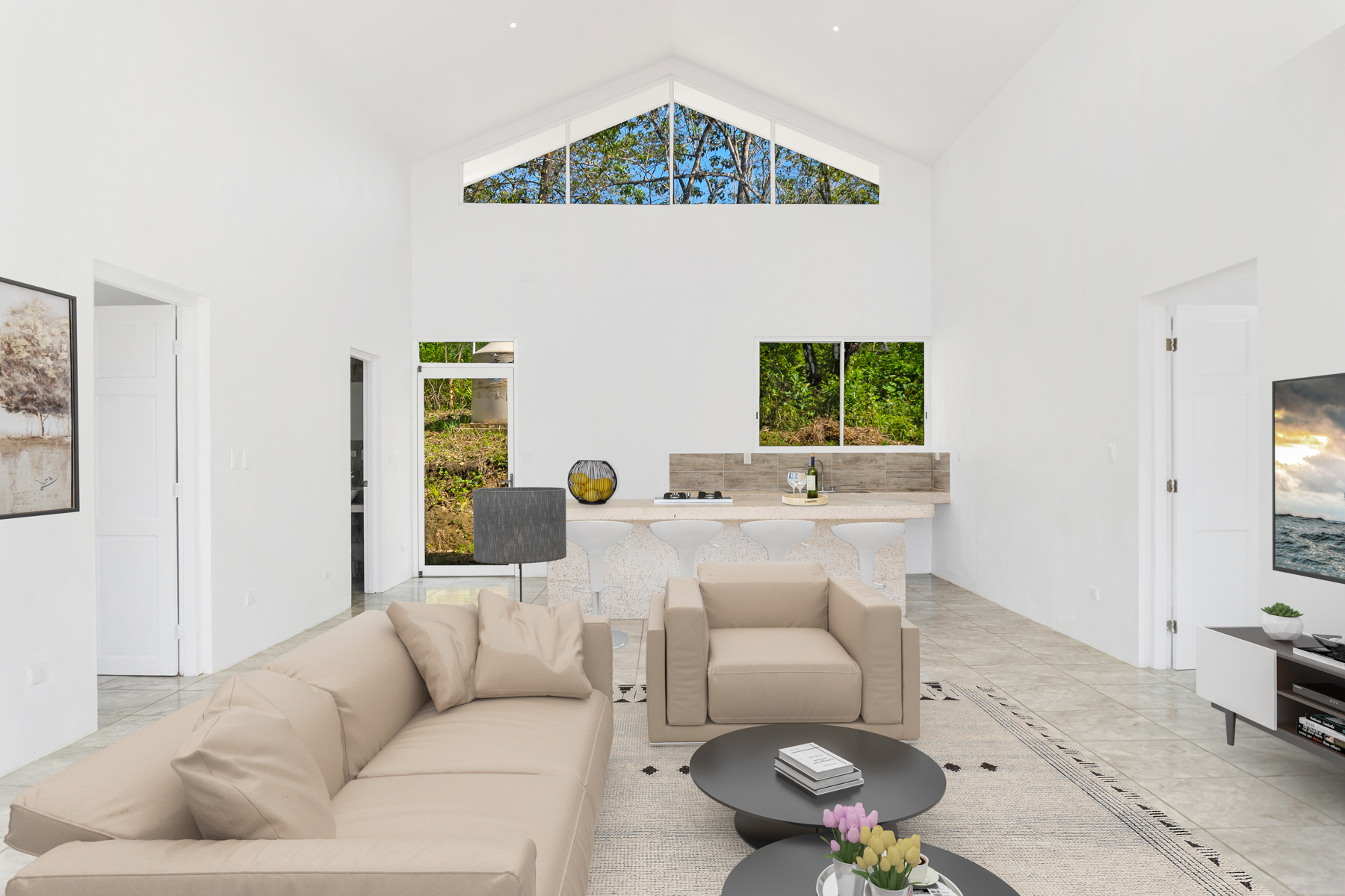 The property boasts high-quality construction with durable concrete, ensuring long-lasting safety and reliability. Inside, you will find two generously sized bedrooms, each featuring its own bathroom for ultimate privacy. The spacious living room is highlighted by soaring ceilings, creating a bright and airy ambiance that invites relaxation. The modern kitchen is well-lit and perfect for culinary enthusiasts and social gatherings.